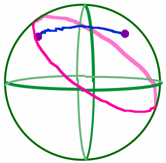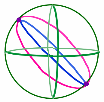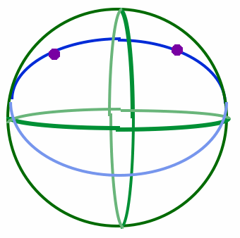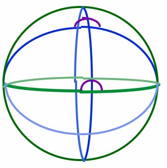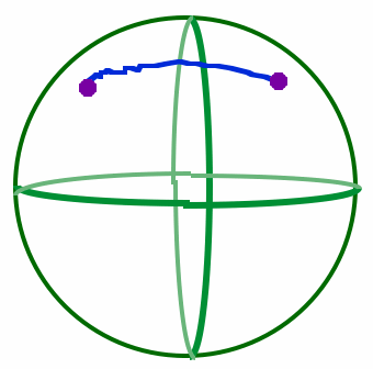 * Notice that in the above discussions, we use circle in two different ways. When defining a great circle, I said that it's a circle which has its center the center of the sphere. In that case, I'm using circle in its usual Euclidean sense -- really, I'm talking about looking at the intersection of a sphere and a plane through its center. The resulting intersection will be a great circle. The interior of such a circle would be inside the sphere. On the other hand, the interior of circles in spherical space lie on the surface of the sphere (because that's all there is in spherical space).